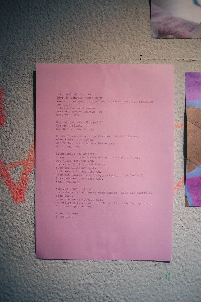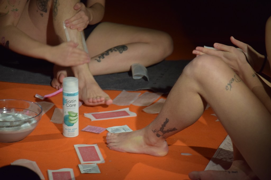Mittels der kollektiven Haarentfernung und selbstverfassten Texten nähern wir uns als weiblich gelesene Personen dem Thema Köperbehaarung an und dessen Stellenwert in unserer Gesellschaft.