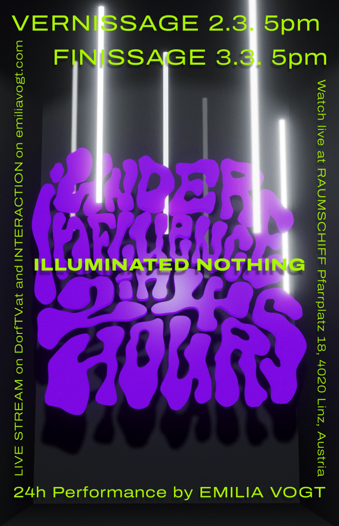 Die Performance „Illuminated Nothing“ konzentriert sich auf das Nichtstun, indem die Performerin Emilia Vogt sich 24 Stunden in einem Raum befindet, der öffentlich einsehbar ist. Das Nichtstun definiert sich auf lebenserhaltende Grundbedürfnisse wie Atmen, Sitzen, Liegen, Stehen, Essen, Trinken und die Toilette benutzen, alle aktiven Tätigkeiten werden bewusst vermieden.