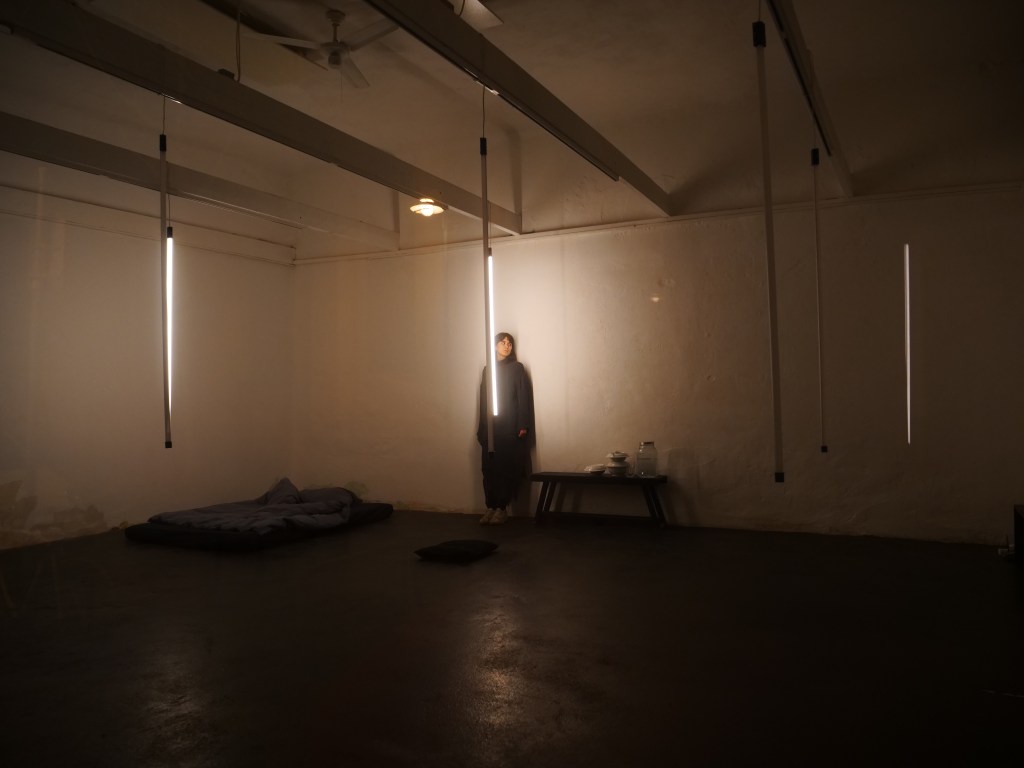 The performer’s inaction is contrasted with the influence from outside, which is made clear by the heteronomy of lights in the room. Seven lights in the room can be switched on and off as desired via an interactive website.